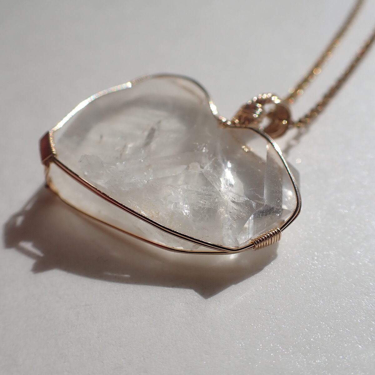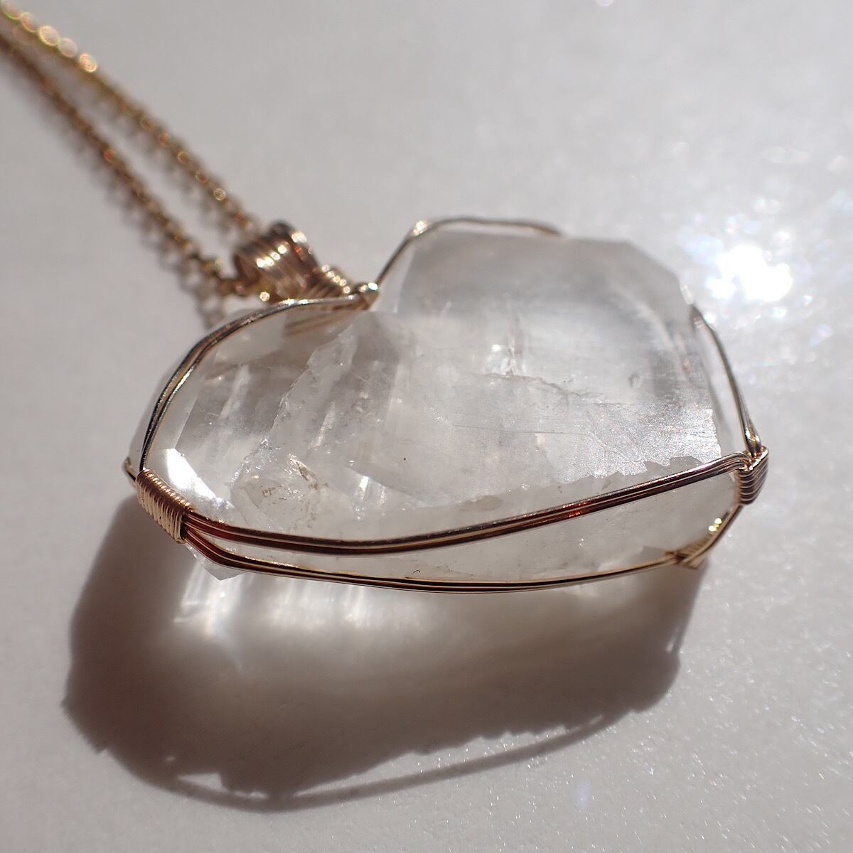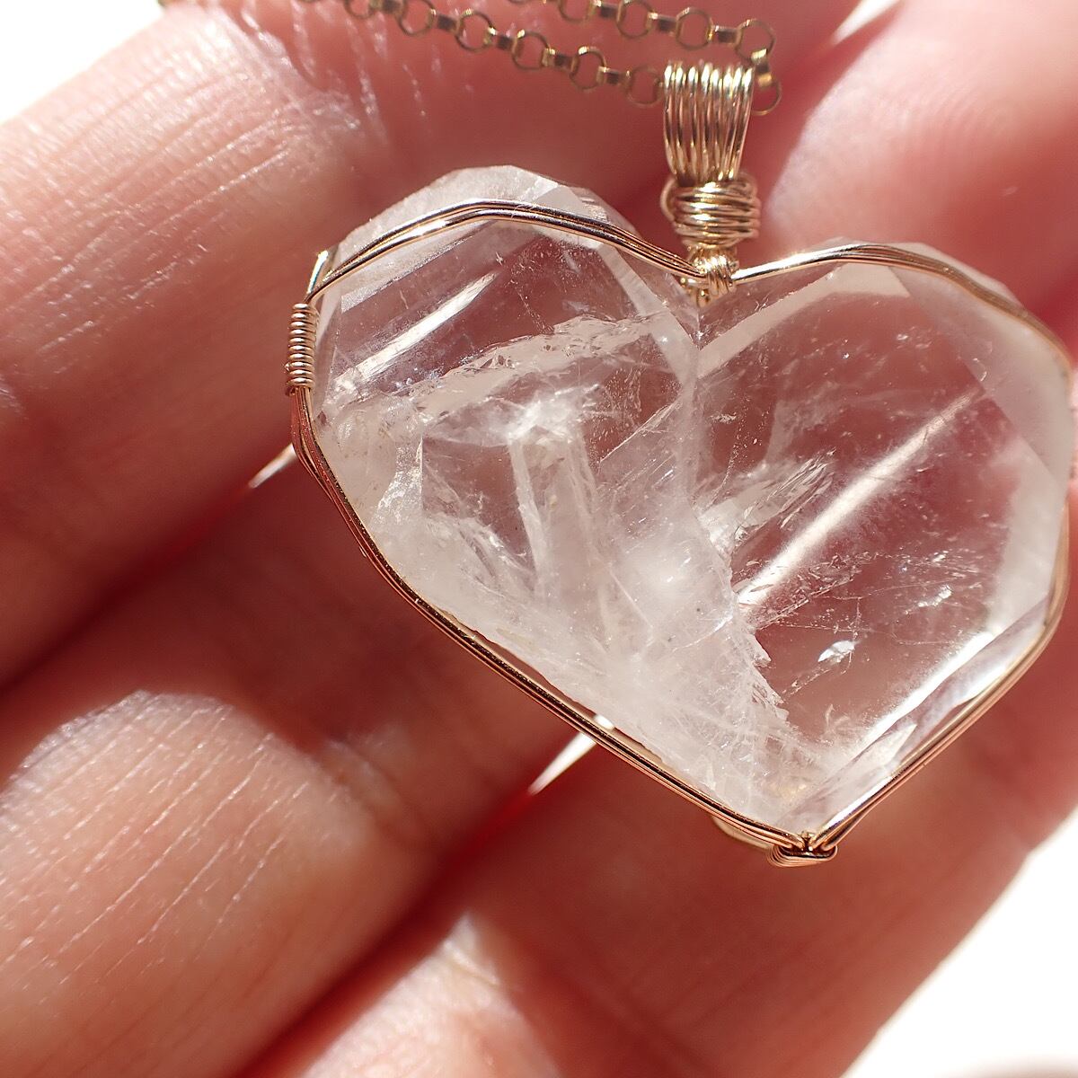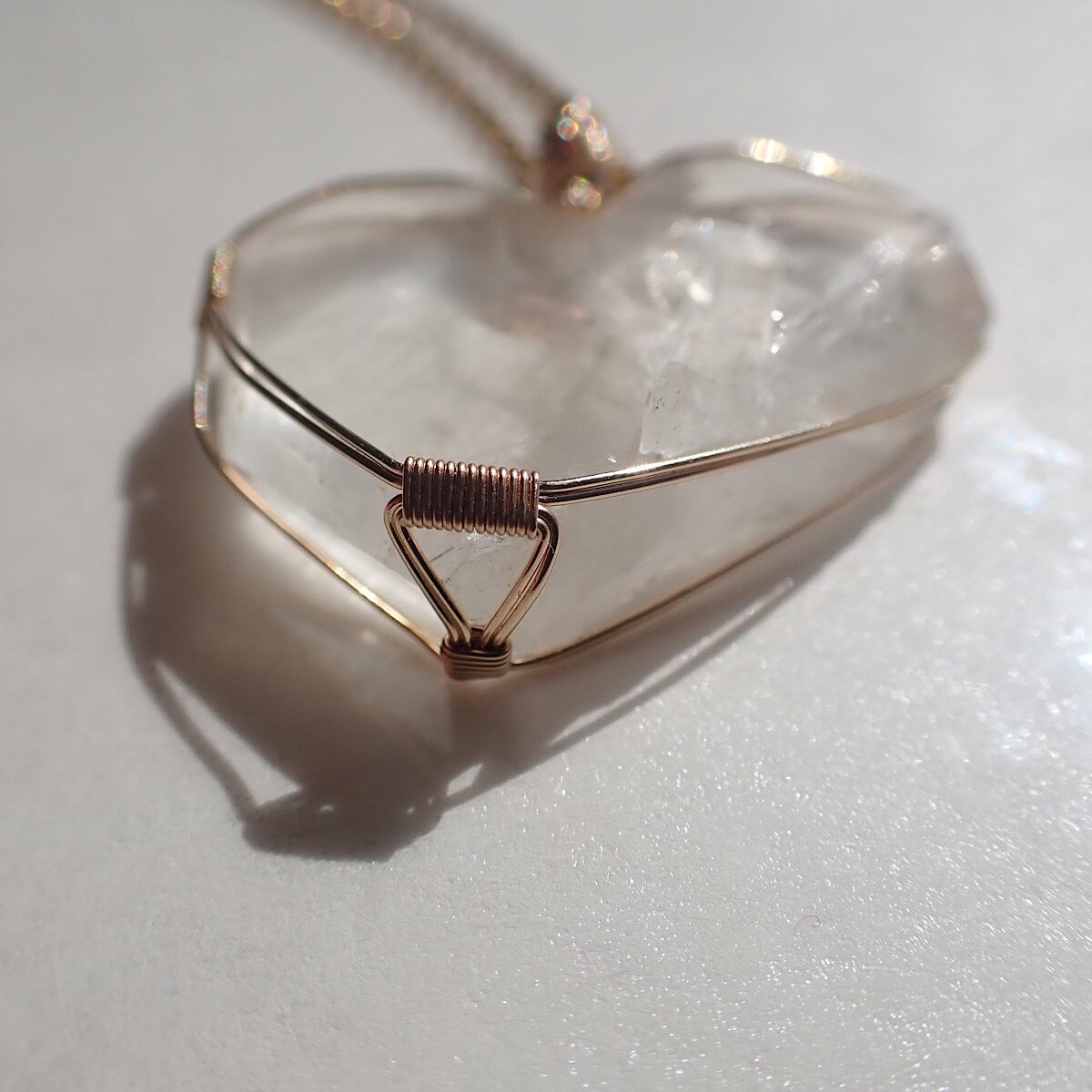長崎県産の日本式双晶水晶です。ハートに近いの形だったのでそれをいかして女神巻きジュエリーにお創りしました。この形、石を見ているとハイヤーセルフとの統合を高めてくれる気がしてきます。本来私たちはいつでも完全体であるという意識を思い出させてくれるのかもしれません。素敵な水晶です。