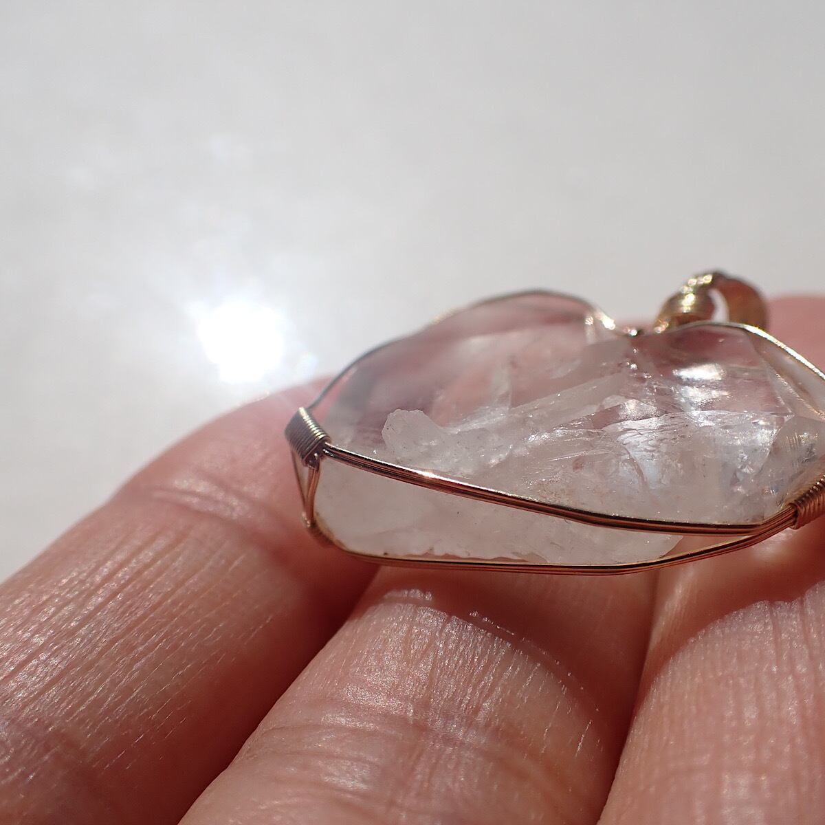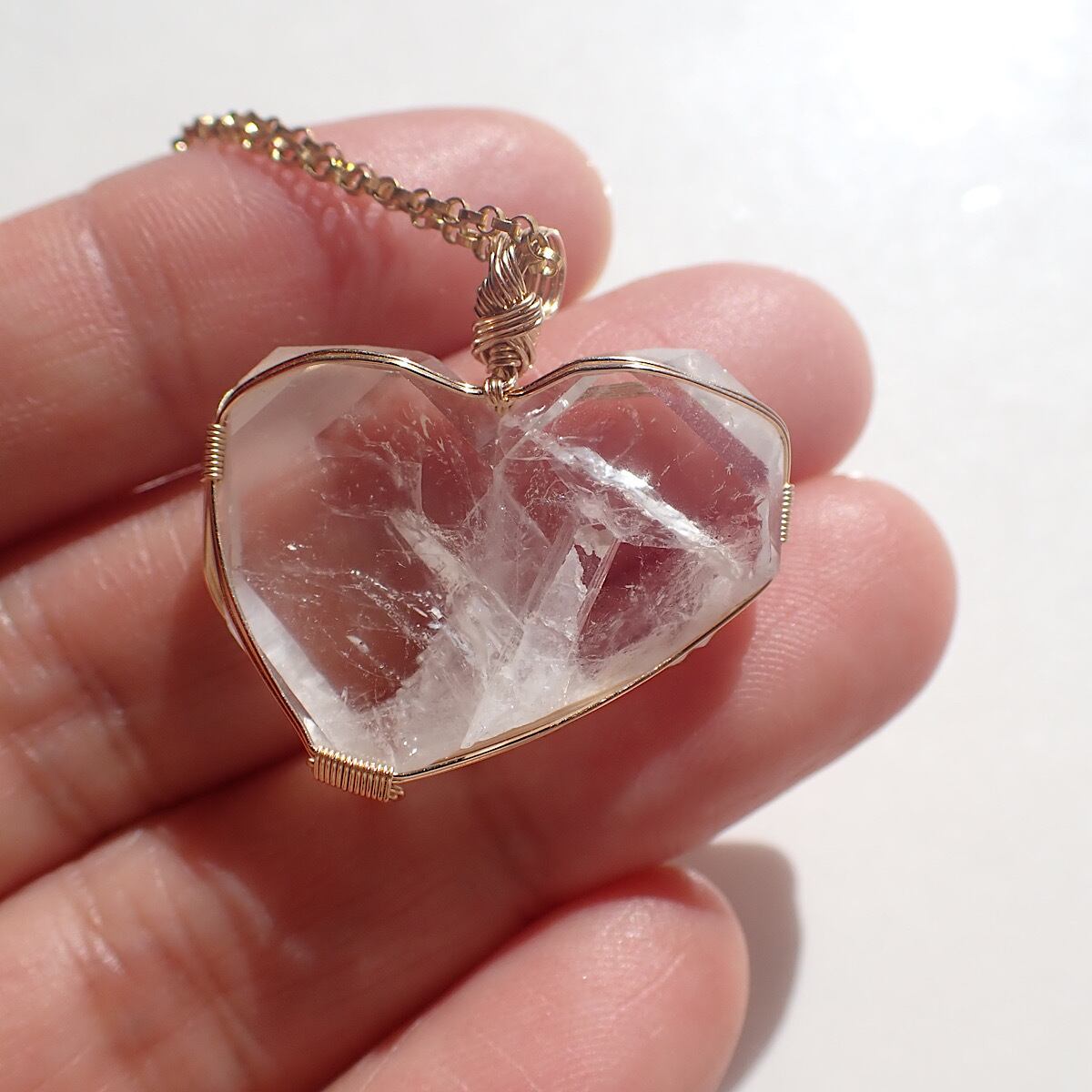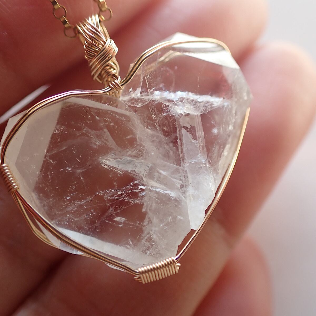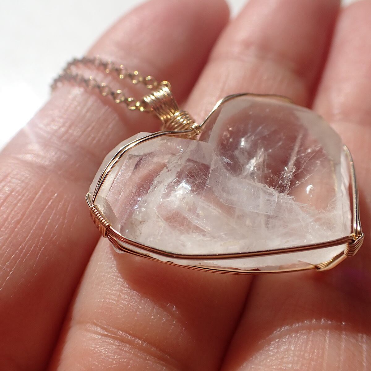 長崎県産の日本式双晶水晶です。ハートに近いの形だったのでそれをいかして女神巻きジュエリーにお創りしました。この形、石を見ているとハイヤーセルフとの統合を高めてくれる気がしてきます。本来私たちはいつでも完全体であるという意識を思い出させてくれるのかもしれません。素敵な水晶です。