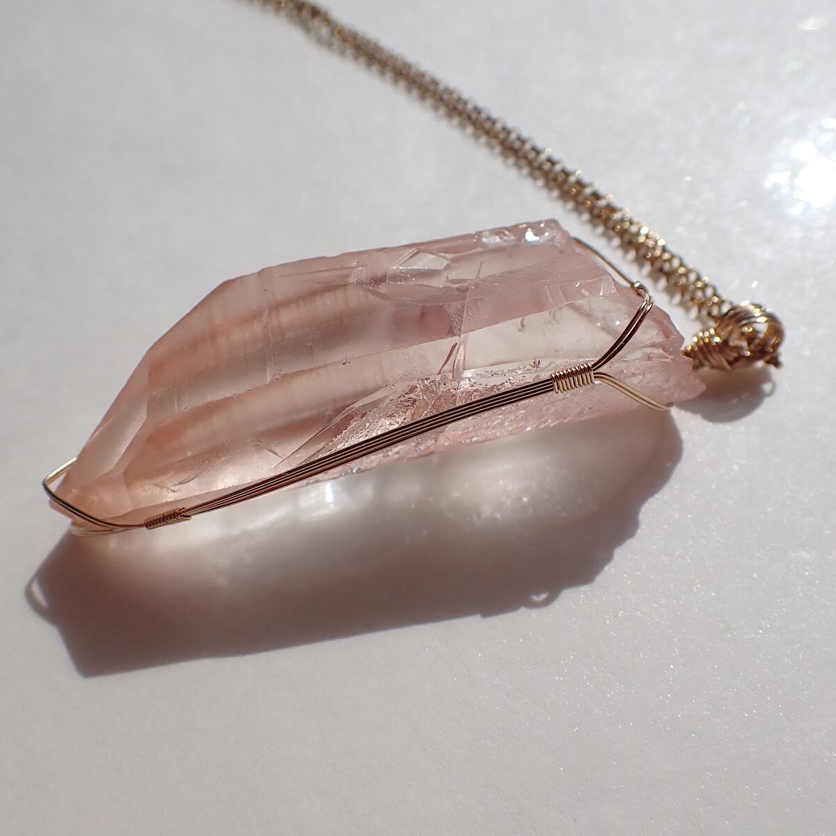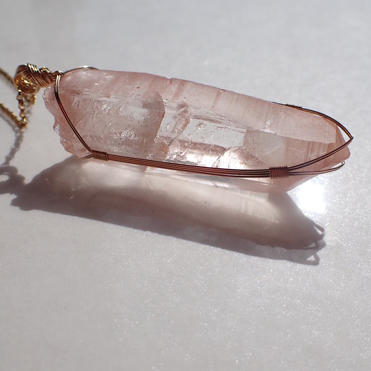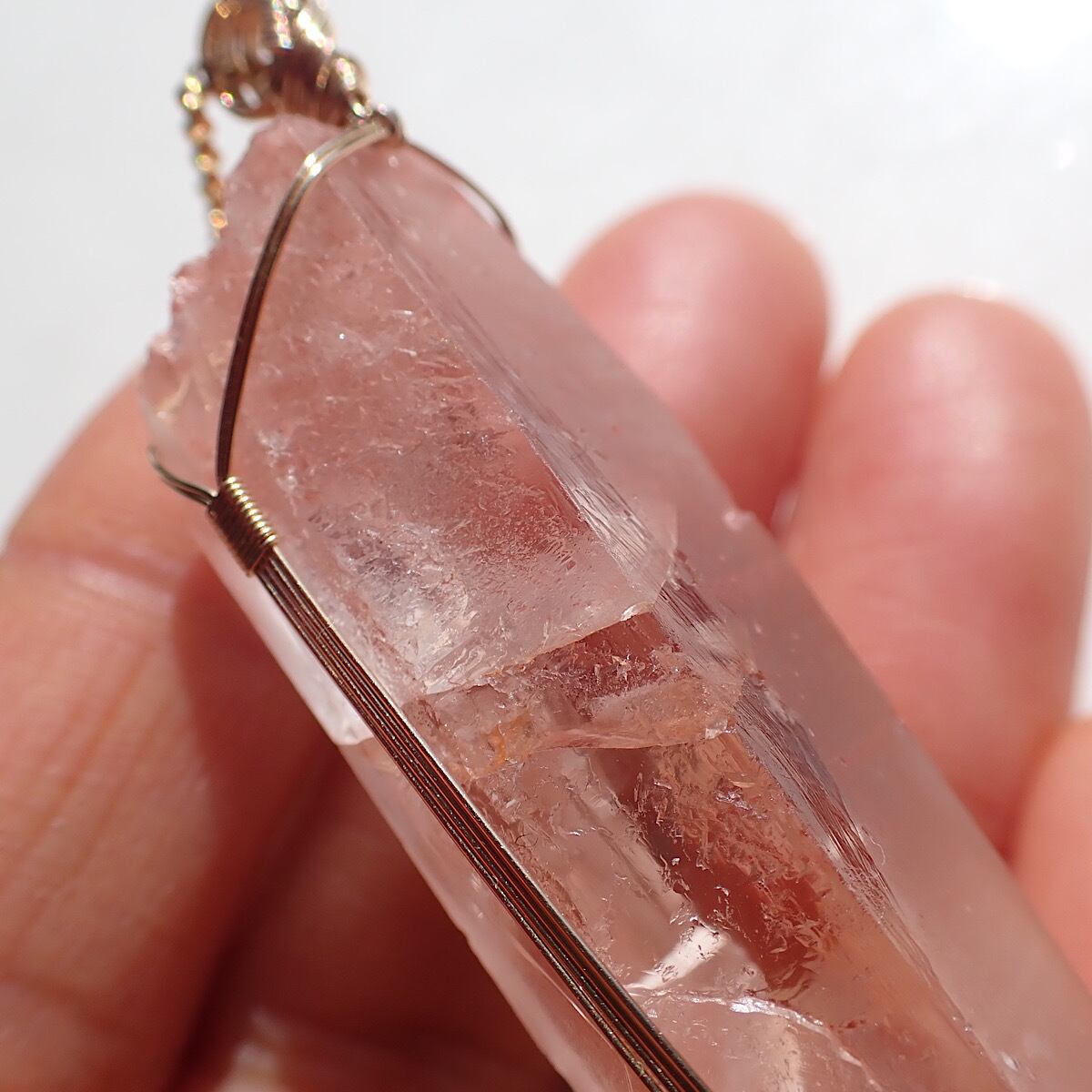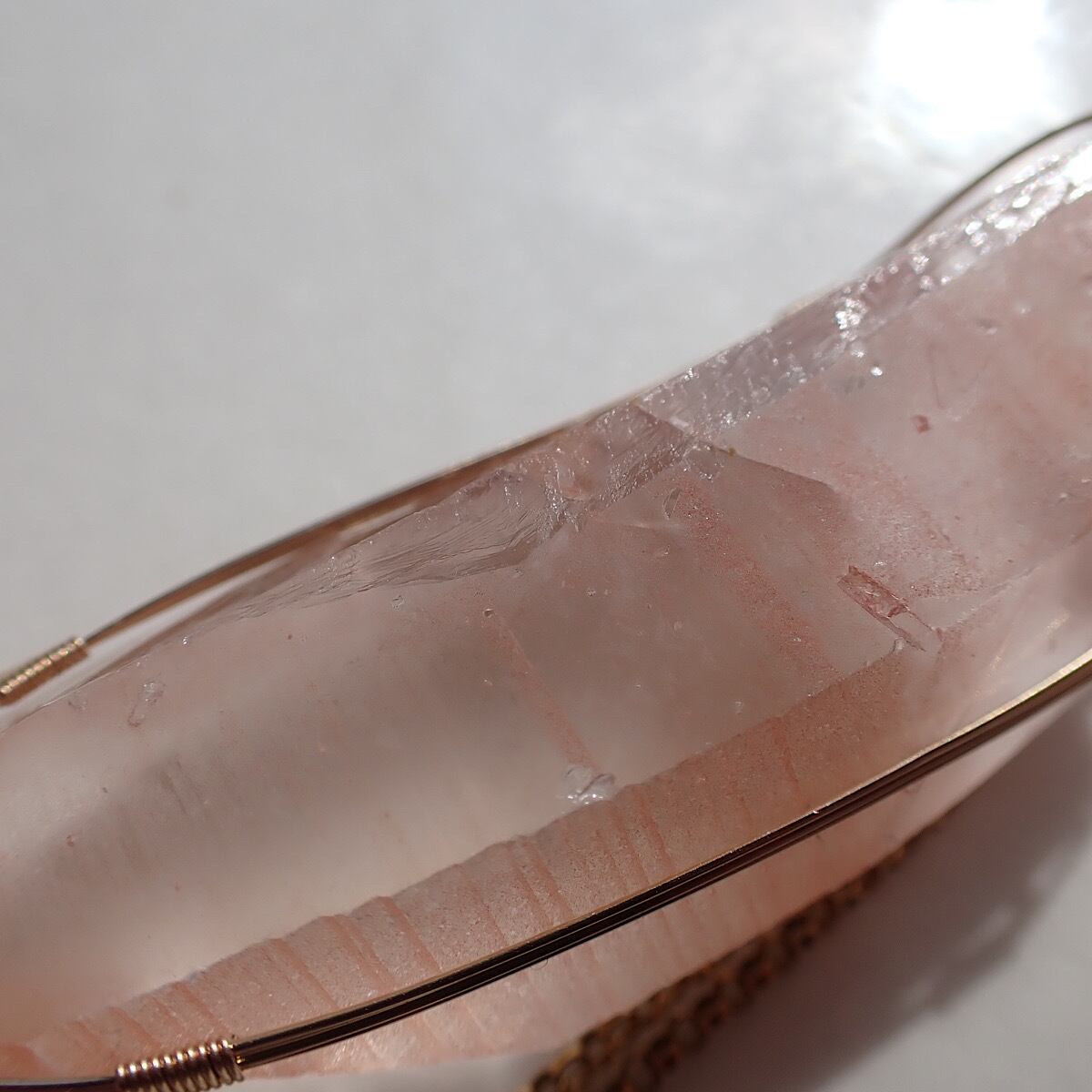 ブラジルのピンクレムリアンの女神巻きジュエリーです。いくつかあったピンクレムリアンの中からこちらが気になってお迎えしました。周囲にあったであろう水晶の痕跡を残しているような模様がとても素敵です。かわいくて癒されるピンクレムリアンです。